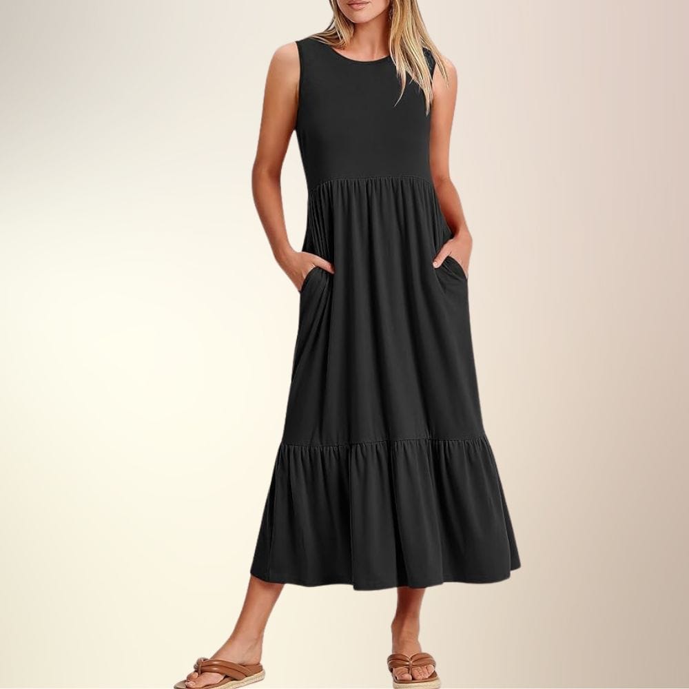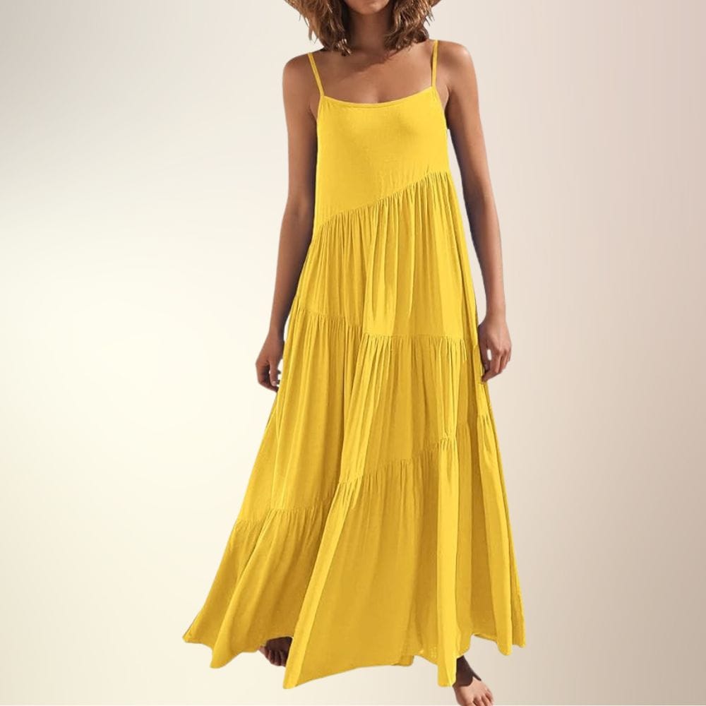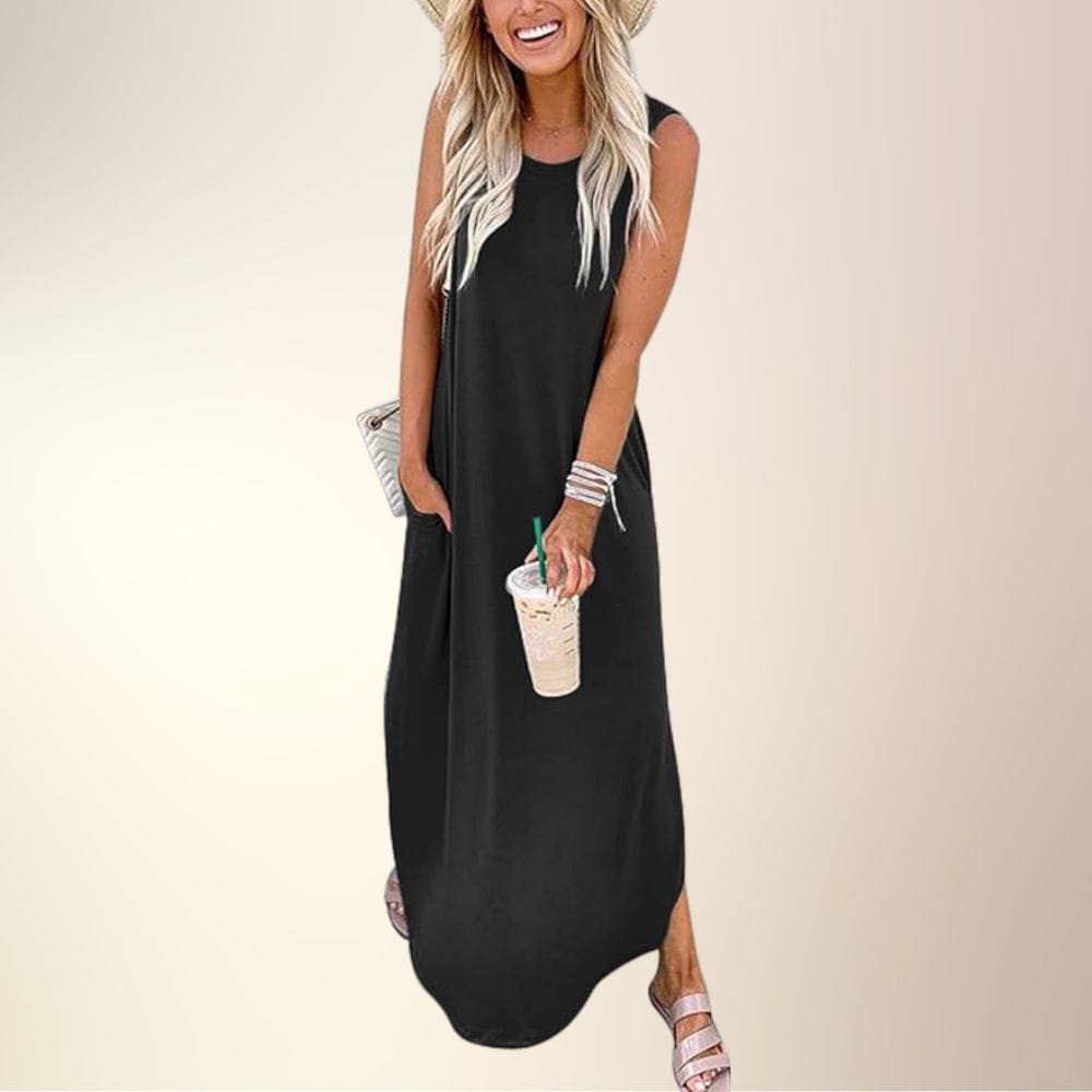 This sundress comes with pockets, adding a practical touch to its design. Available in various colors, it allows you to choose the one that best suits your style. The dress's loose fit makes it a versatile piece that can be dressed up or down, making it a staple in any summer wardrobe.