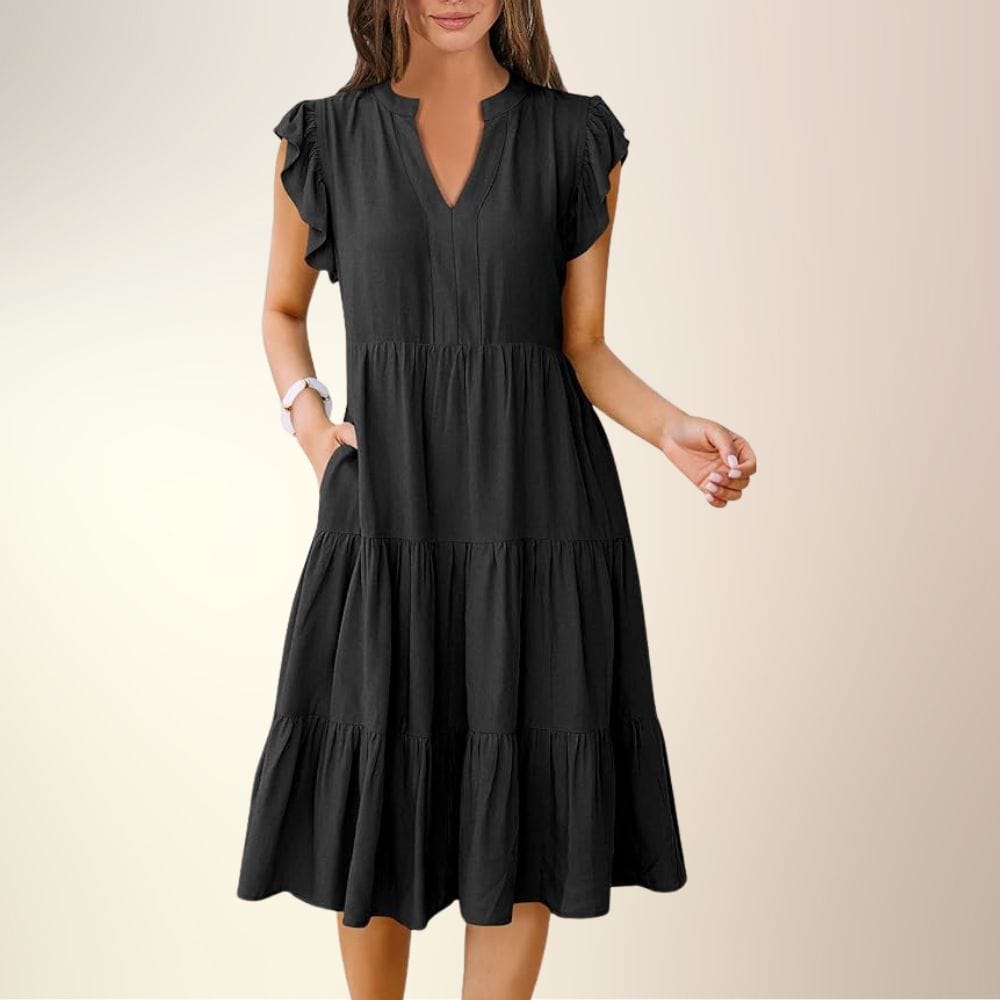 Made from soft and comfortable materials, this dress ensures you stay comfortable throughout the day. The ruffle sleeves add a playful touch, while the V-neck design enhances its overall appeal. Available in various colors, this dress allows you to choose the one that best suits your style.