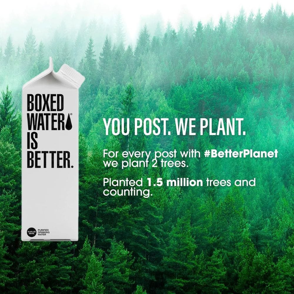 Boxed Water Is Better goes beyond just offering a sustainable product; they actively contribute to environmental conservation. The company has partnered with the National Forest Foundation to plant trees across the United States. For every social media post with the hashtag #BetterPlanet, Boxed Water plants two trees, demonstrating their commitment to reforestation.