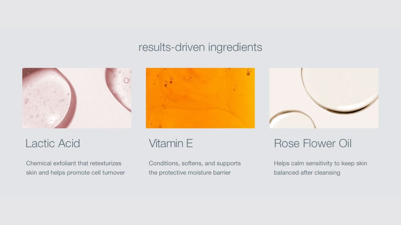 - Key ingredients like lactic acid and rose flower oil work together to remove dulling surface debris while providing hydration and antioxidants.