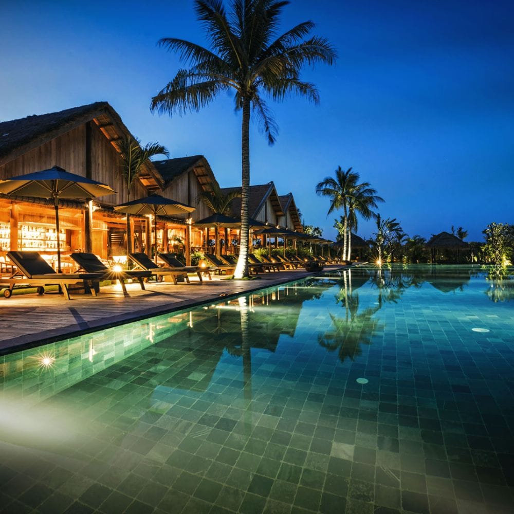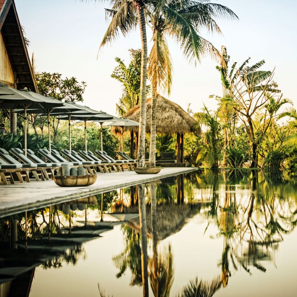 - The hotel is a perfect blend of luxury and nature, featuring 45 private terrace and pool villas styled like traditional stilted farmhouses, set amidst rice paddies and private gardens.