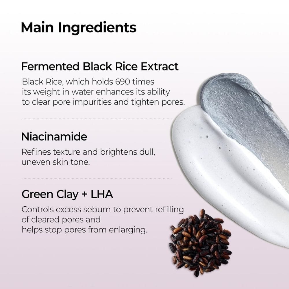 Other essential ingredients include aqua (the primary water base), butylene glycol (a humectant for moisture), cetearyl olivate and sorbitan olivate (natural emollients and emulsifiers for skin softness), glyceryl stearate (an emollient for gentle cleansing), kaolin (a clay for deep pore cleansing and oil absorption), oryza sativa (fermented black rice for purifying and brightening), peat water (for skin purification), sodium polyacrylate (for texture and foam stability), and both fragrance and parfum (for a pleasant sensory experience).