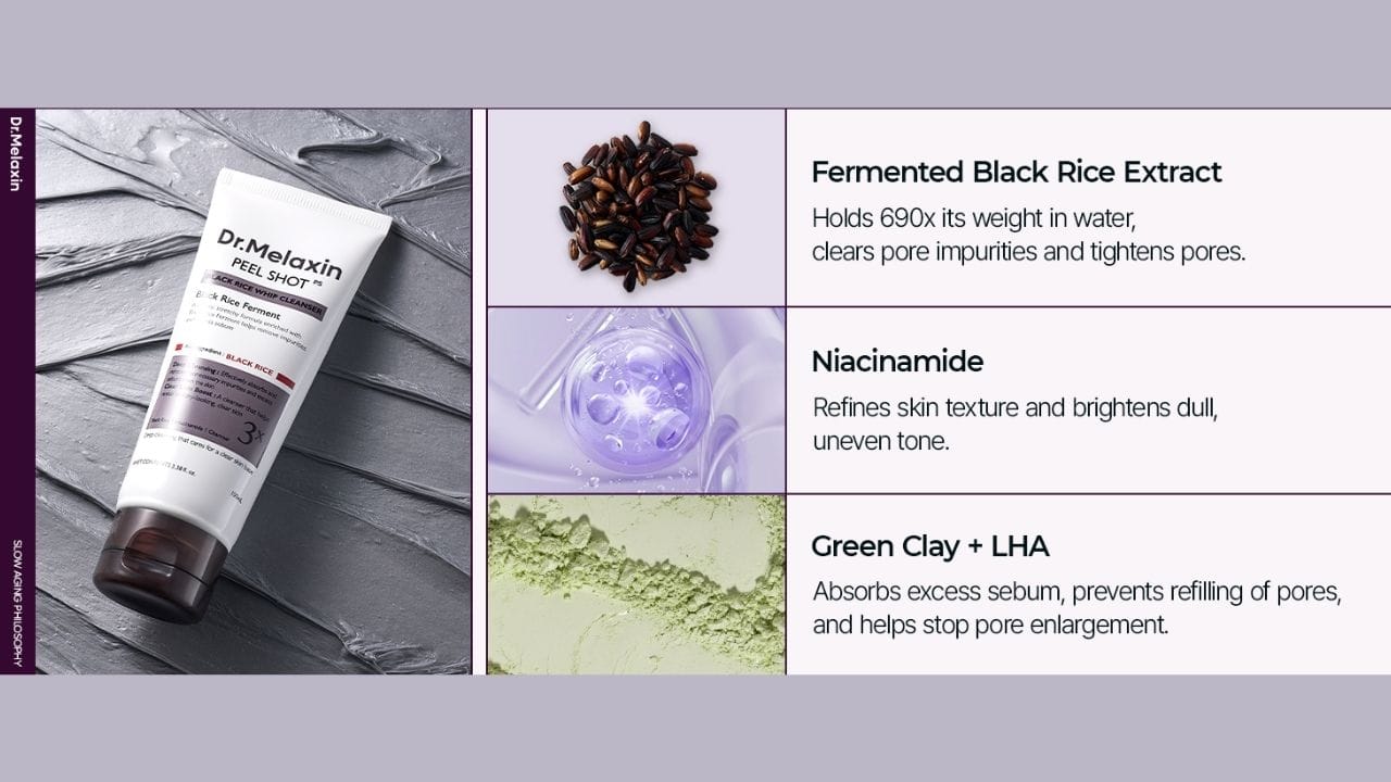 - The Dr. Melaxin Peel Shot Black Rice Mochi Whip Cleanser is formulated with powerful ingredients like capryloyl salicylic acid and hyaluronic acid, targeting uneven skin tone and clogged pores.