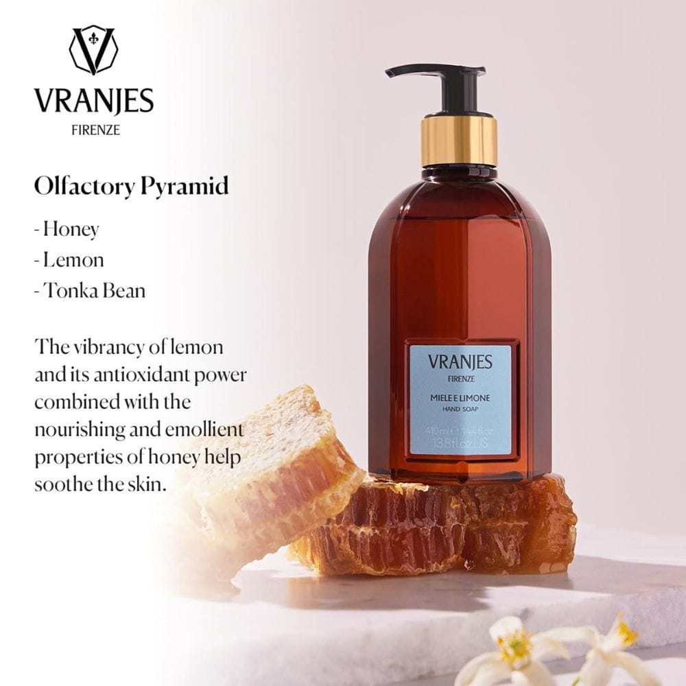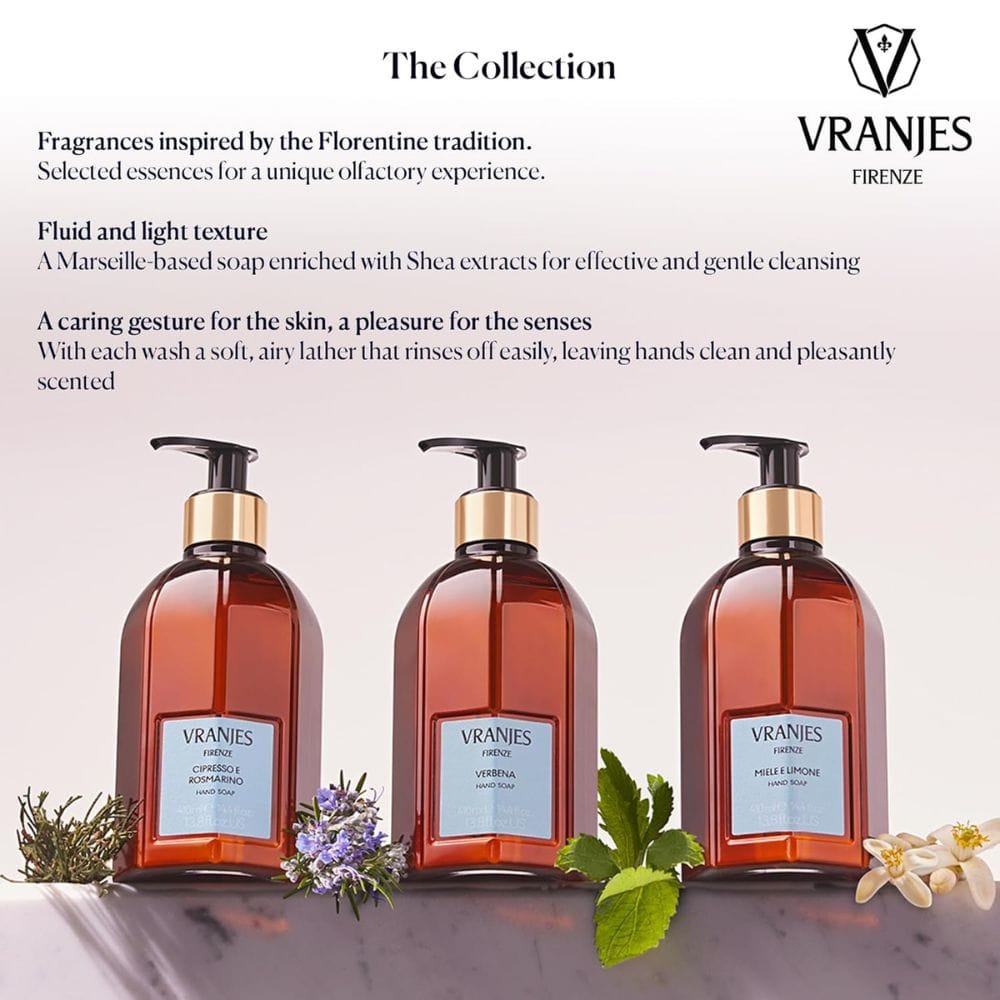 Crafted in the heart of Tuscany, this soap is inspired by the Florentine tradition, where artistry meets functionality. The delicate and fluid, light texture of the Marseille-based soap offers a unique olfactory experience fluid, making each wash a soft, airy lather that is a pleasure for the skin—a cleansing, caring gesture. The fragrance is composed of essences for a unique sensory experience, with complementary souls housed within each bottle, such as the two complementary souls of honey and lemon, or the harmonious blend where cypress meet rosemary, evoking the authentic Tuscan landscape. The fluid and light texture, enriched with Shea extracts, leaves your hands feeling clean, gently scented, and pampered.