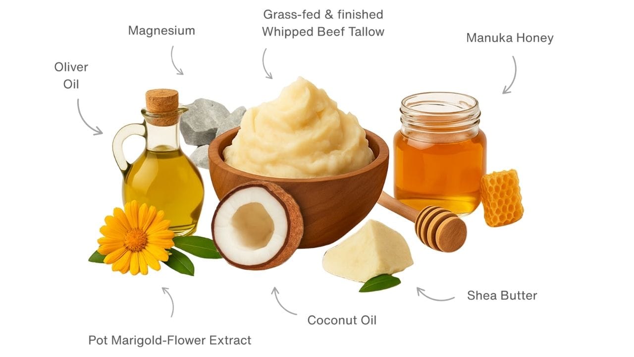 Grass-finished beef tallow is rich in vitamins and fatty acids that nourish the skin and support its barrier function. This is particularly important for maintaining healthy skin, especially for those with sensitive or dry skin. Manuka honey adds an extra layer of healing, with its antibacterial properties helping to soothe and repair the skin. Together, these ingredients create a powerful balm that addresses multiple concerns effectively.