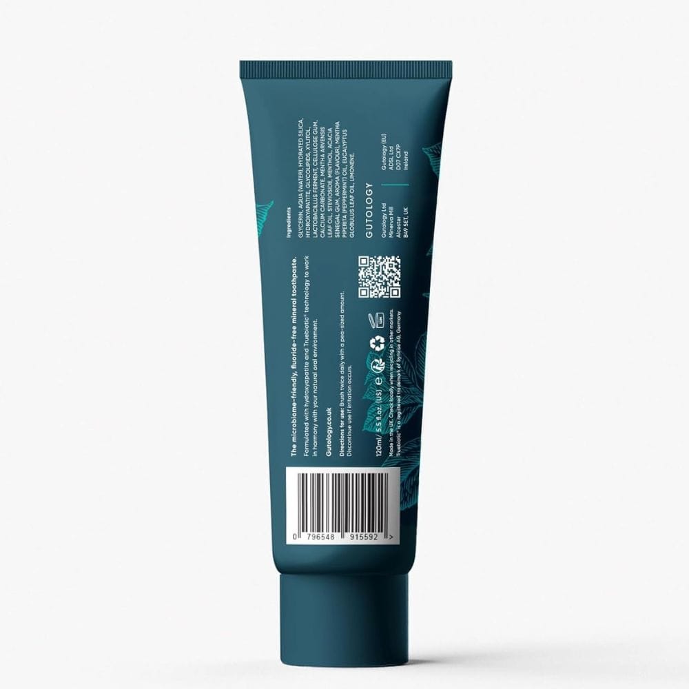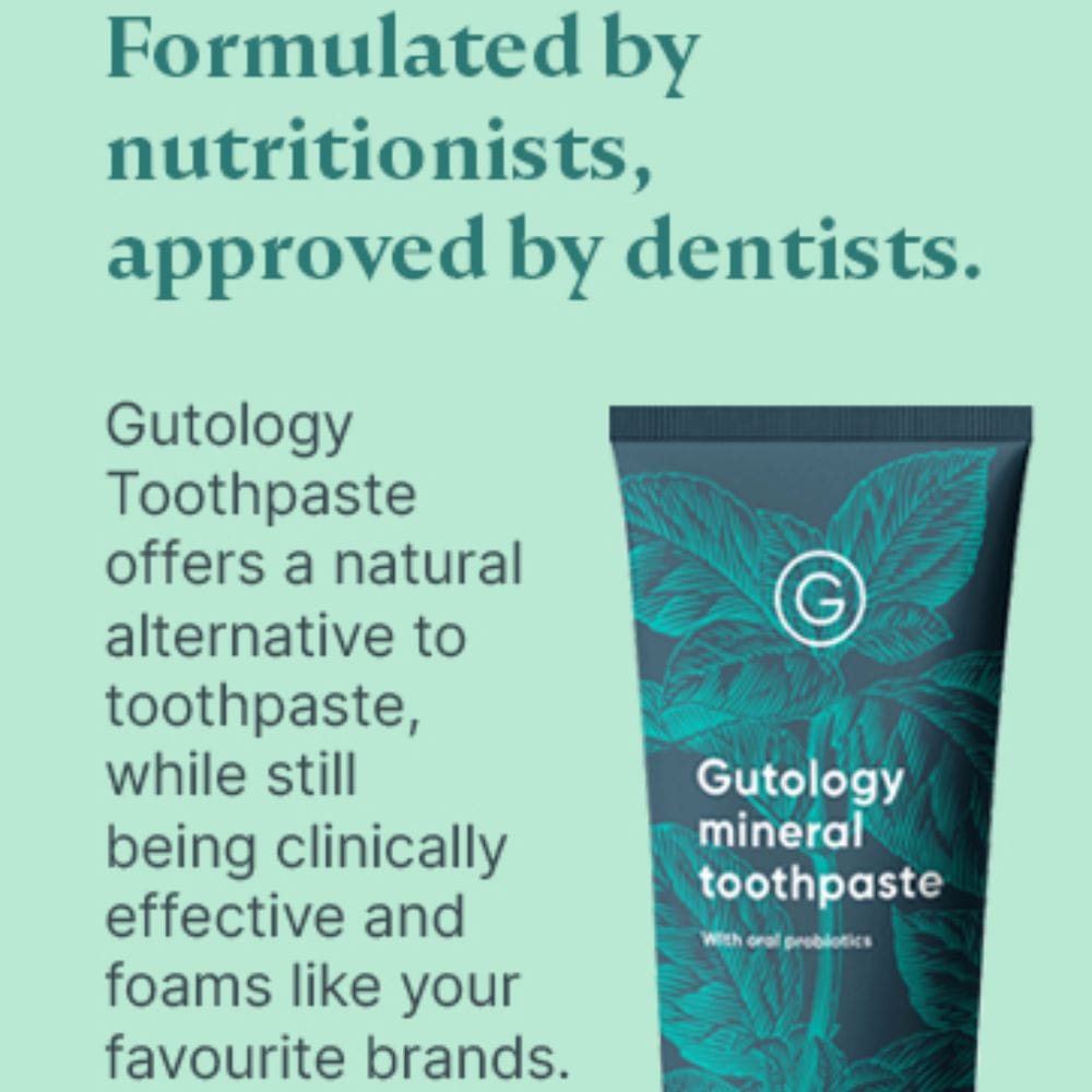 Unlike many big brand toothpastes that rely on harsh chemicals, Gutology mineral toothpaste replaces these with more natural alternatives. Its unique blend of natural hydroxyapatite, calcium carbonate, and cellulose gum works together to remineralise teeth, reduce tooth sensitivity, and keep gums healthy. This microbiome friendly approach means you’re not just cleaning your teeth—you’re actively supporting the balance of good bacteria that help prevent gum disease and promote long-term oral health.