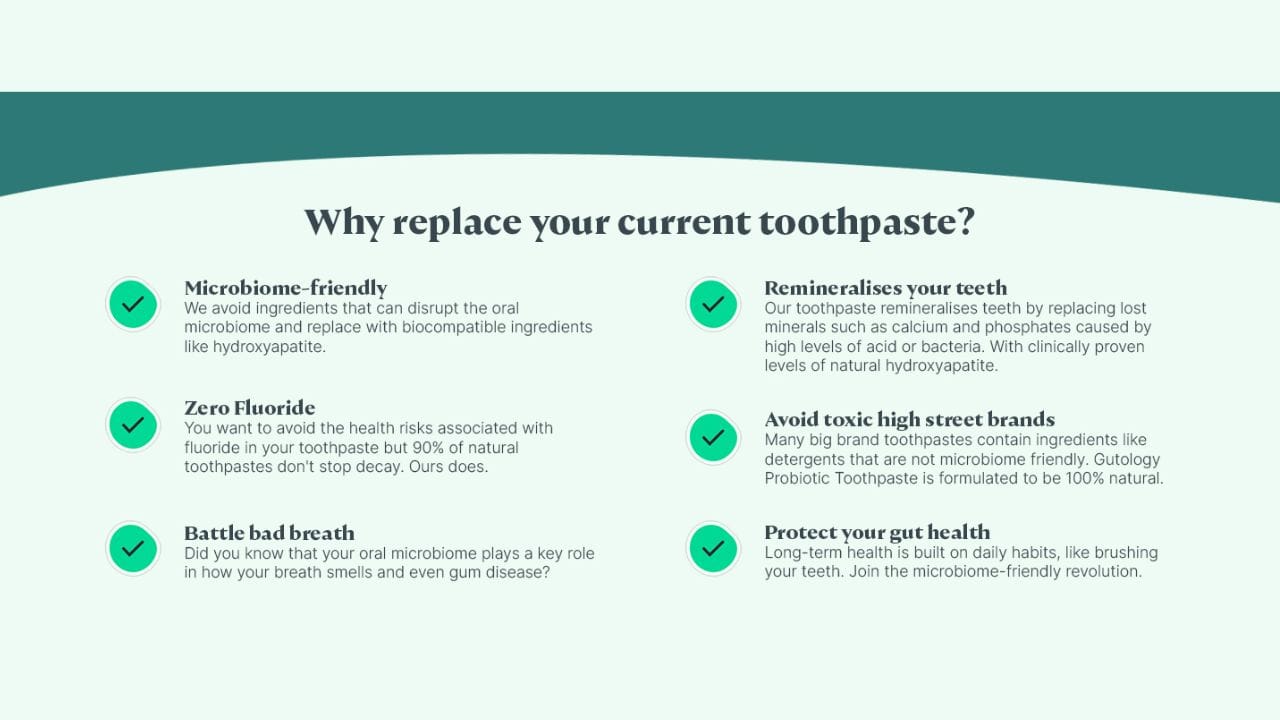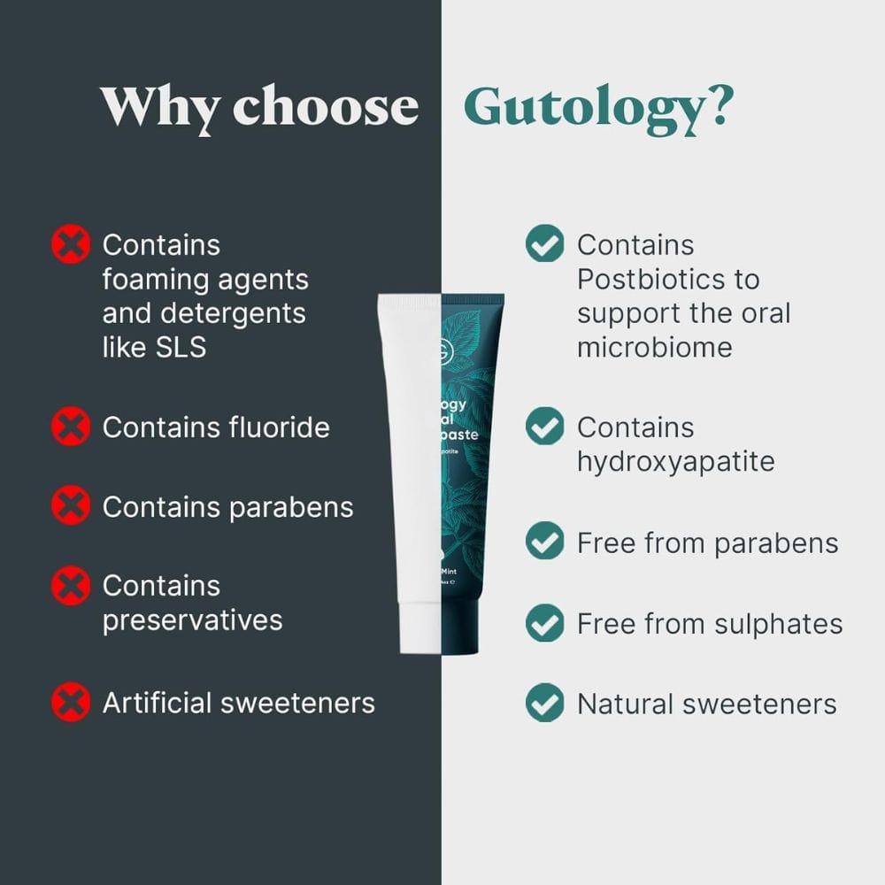With Gutology, you’re not only investing in a toothpaste that remineralises teeth and soothes tooth sensitivity, but also in a product that supports the oral microbiome—an essential factor in achieving lasting oral health. For those looking to keep their gums healthy and enjoy long-term benefits, Gutology’s natural probiotic hydroxyapatite toothpaste is a microbiome friendly solution that truly makes a difference.