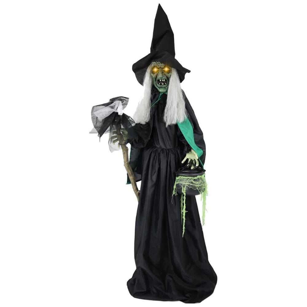 Haunted Hill Farm Lifesize Scary Talking Witch Prop with Cauldron and Broom