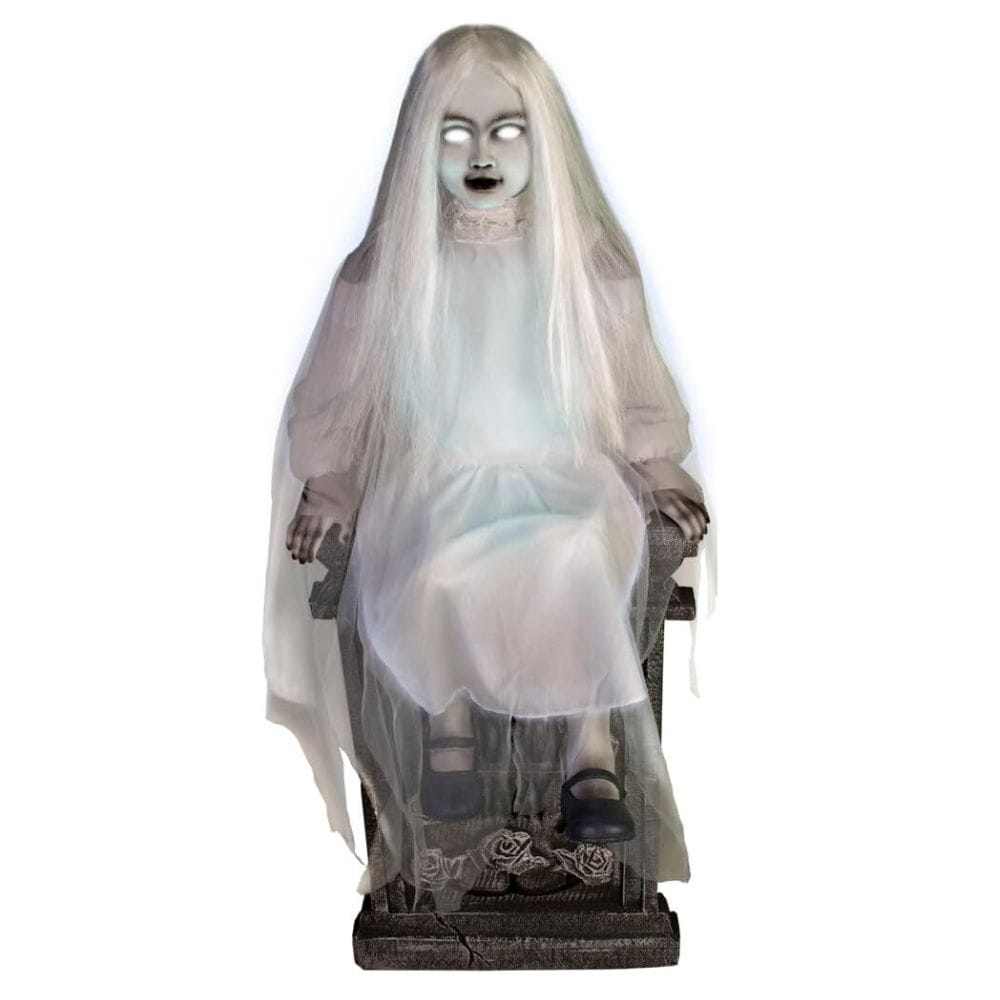 The Haunted Hill Farm Motion-Activated Sitting Tombstone Girl by Tekky is a chilling addition to any Halloween display. This animatronic features a girl sitting on a tombstone, with glowing red eyes and a menacing presence. The girl's head moves and her mouth opens to emit creepy sounds, adding to the overall eerie effect.