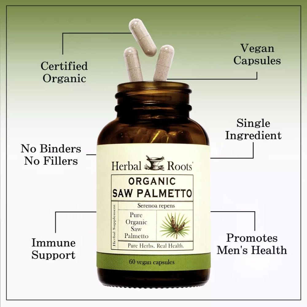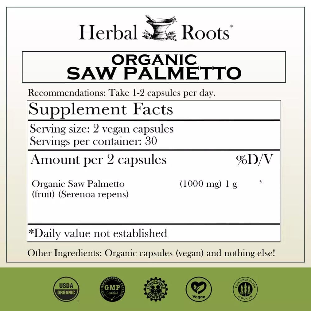 - Herbal Roots Organic Saw Palmetto features a clean formula free from fillers, binders, soy, gluten, and dairy.