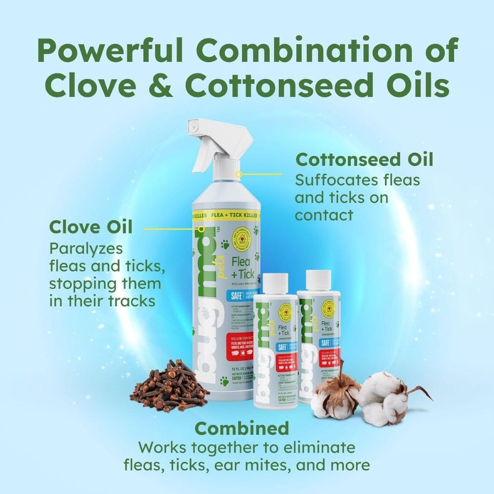 - Plant-Based Power: BugMD Flea and Tick Concentrate utilizes plant-based active ingredients like clove oil and cottonseed oil, making it a safer choice for homes with pets and children. The product is non-toxic and safe for use around kids.