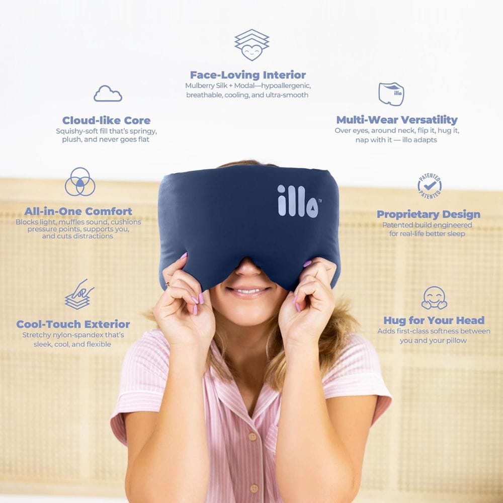 - The Illo Wearable Pillow Sleep Mask is a blackout sleep mask with a pillowy soft design, offering wearable sleep versatility by combining the comfort of a plush pillow and the functionality of a sleep mask for improved rest anywhere.