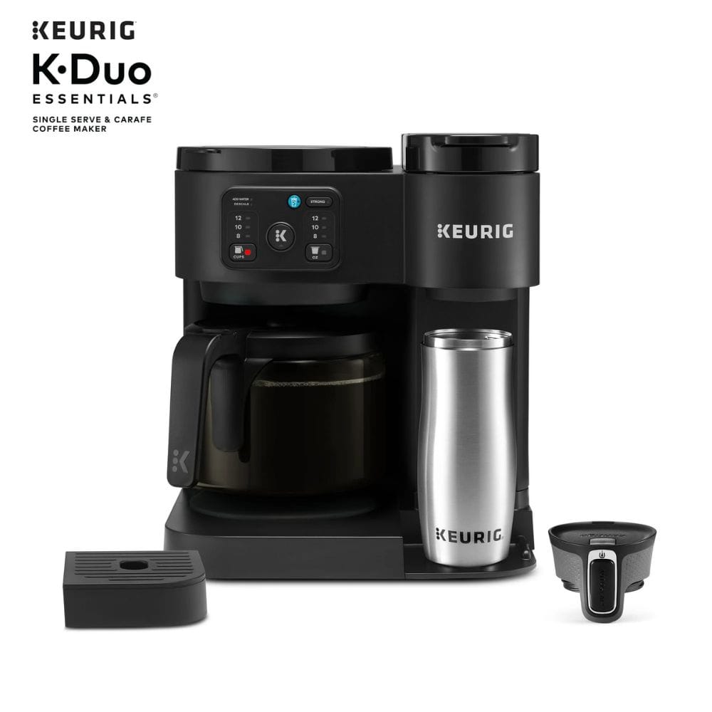 - The Keurig K-Duo Essentials is a budget-friendly 2-in-1 coffee maker designed to brew both K-Cup pods and ground coffee using a 12 cup glass carafe.