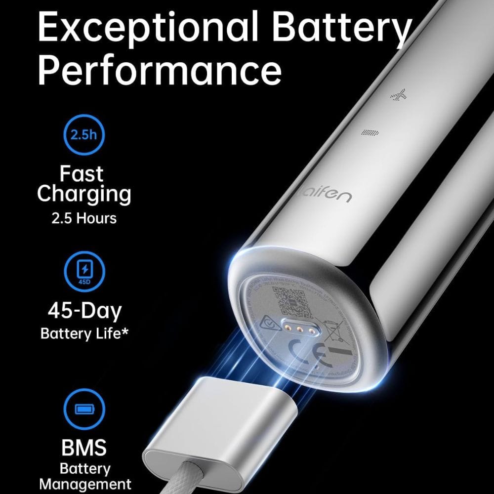 The Laifen Wave Electric Toothbrush offers a long-lasting battery life, ensuring you won't be left without power when you need it most. The battery indicator lights provide clear information about the remaining battery life, so you always know when it's time to recharge.