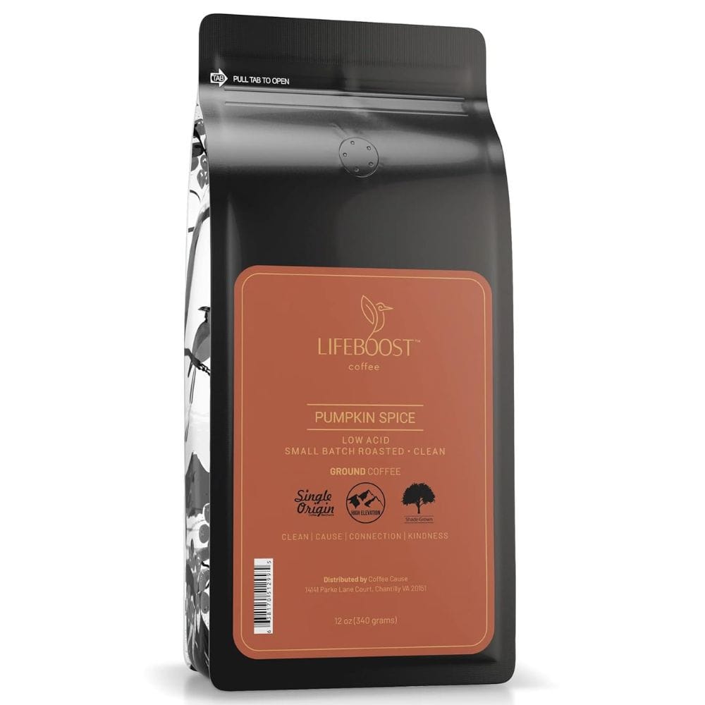 When autumn leaves start to fall, it's time for the Life Boost Pumpkin Spice to shine. This seasonal favorite encapsulates the essence of fall with its blend of cinnamon, nutmeg, and allspice. The coffee beans are spring water-washed and sun-dried, ensuring that the pumpkin spice flavor is pure and pronounced. It's a cup of unusually low-acid coffee that's easy on the stomach and delightful on the palate.