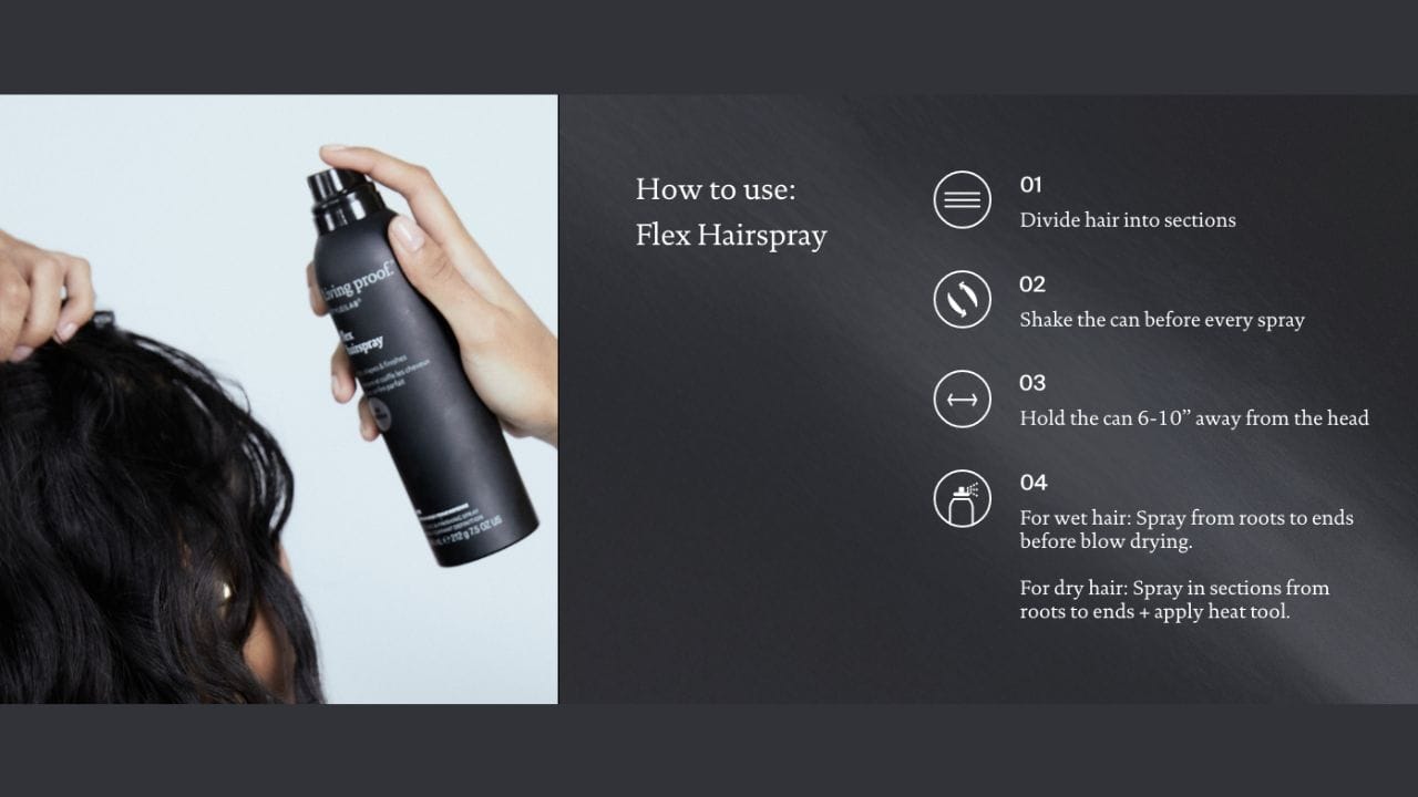 For best results on wet hair, spray Style Lab Flex Hairspray from roots to ends lightly before blow drying. For best results on dry hair, spray a section of hair from roots to ends before applying heat.