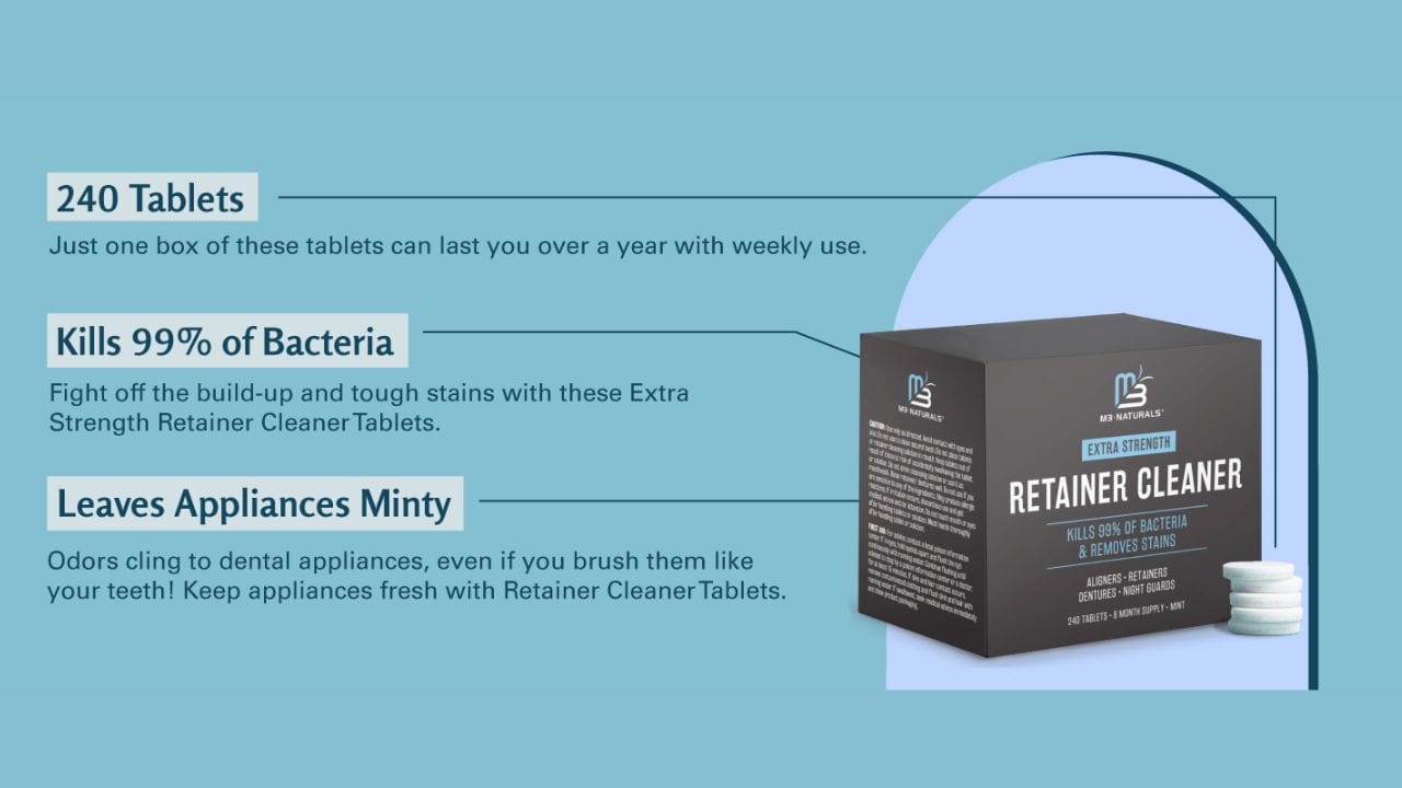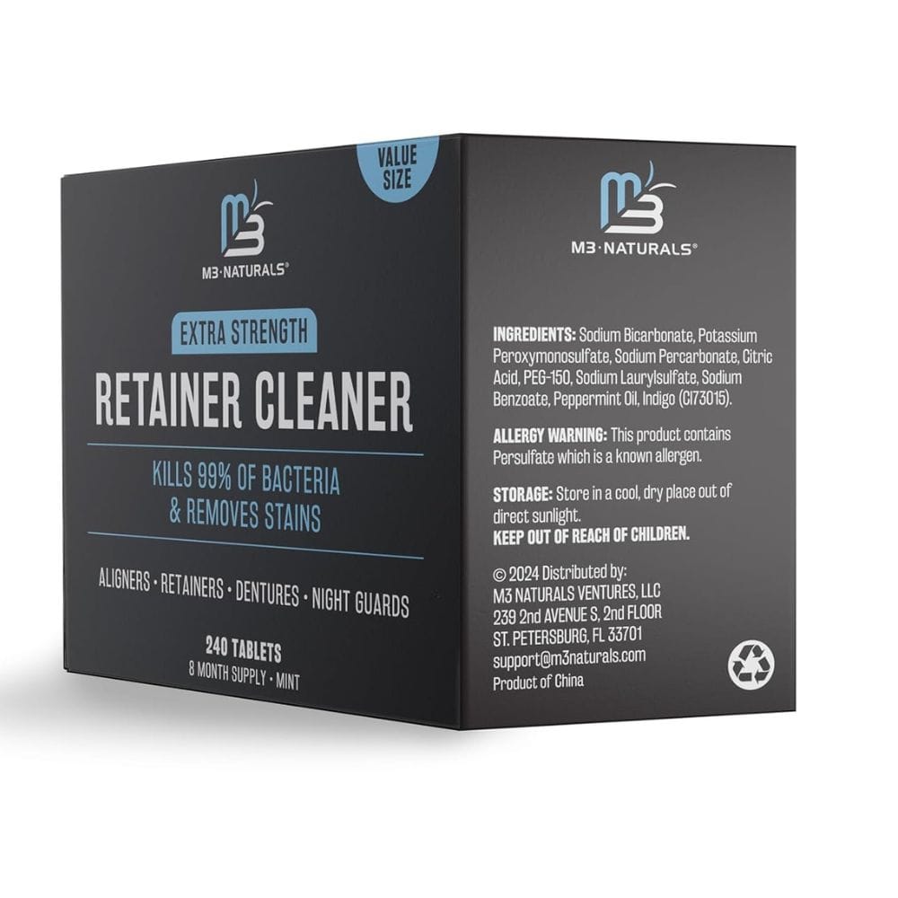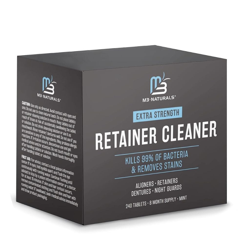 - M3 Naturals Retainer and Denture Cleanser effectively removes odors, discoloration, and stains from various oral dental appliances.