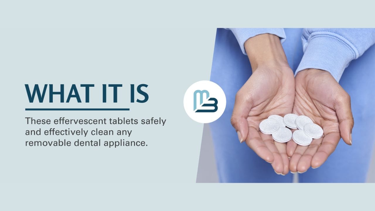 - This extra-strength, effervescent, mint-flavored tablet is suitable for daily use on a variety of items such as retainers, dentures, aligners, and mouthguards.