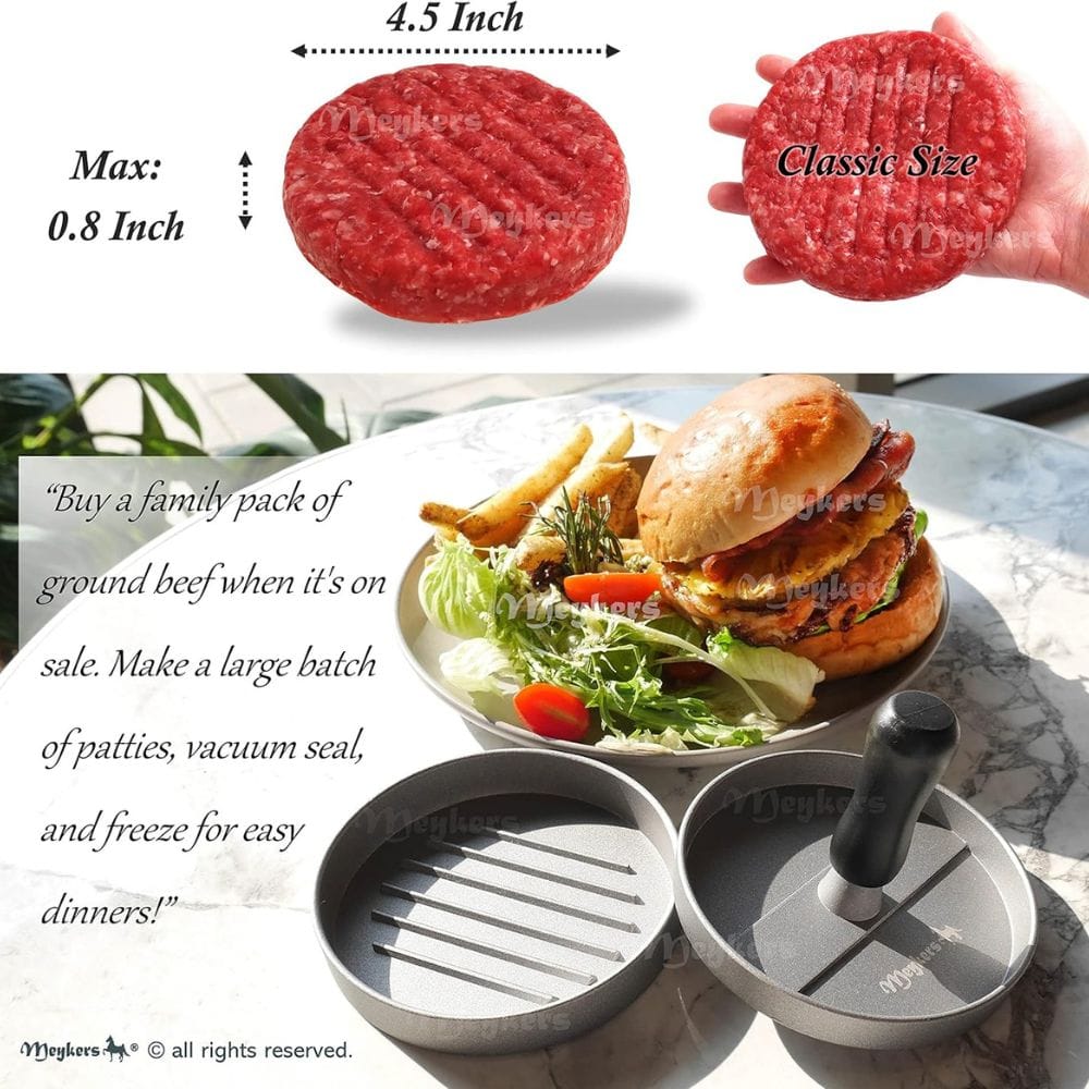 - The Meykers Burger Press ensures consistent, perfectly shaped patties every time.