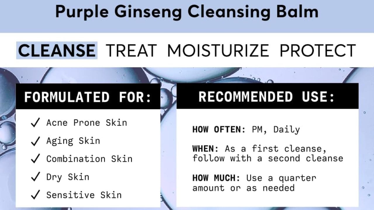 - Formulated with a blend of potent ingredients like purple ginseng, linoleic-rich oils, plant-based esters, and various plant extracts, this balm caters to all skin types, including sensitive and acne-prone skin. It is designed for daily use as part of a thorough evening skincare routine.