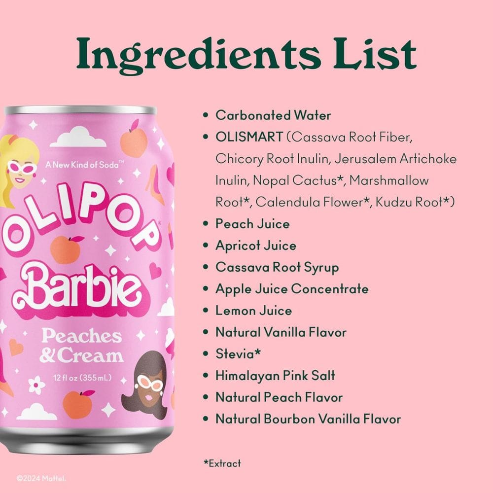 Olipop Barbie Peaches and Cream is made with a blend of high-quality ingredients. The primary ingredients include carbonated water, real peach juice, natural vanilla flavor, and apricot juice. These ingredients give the soda its unique and delicious taste.