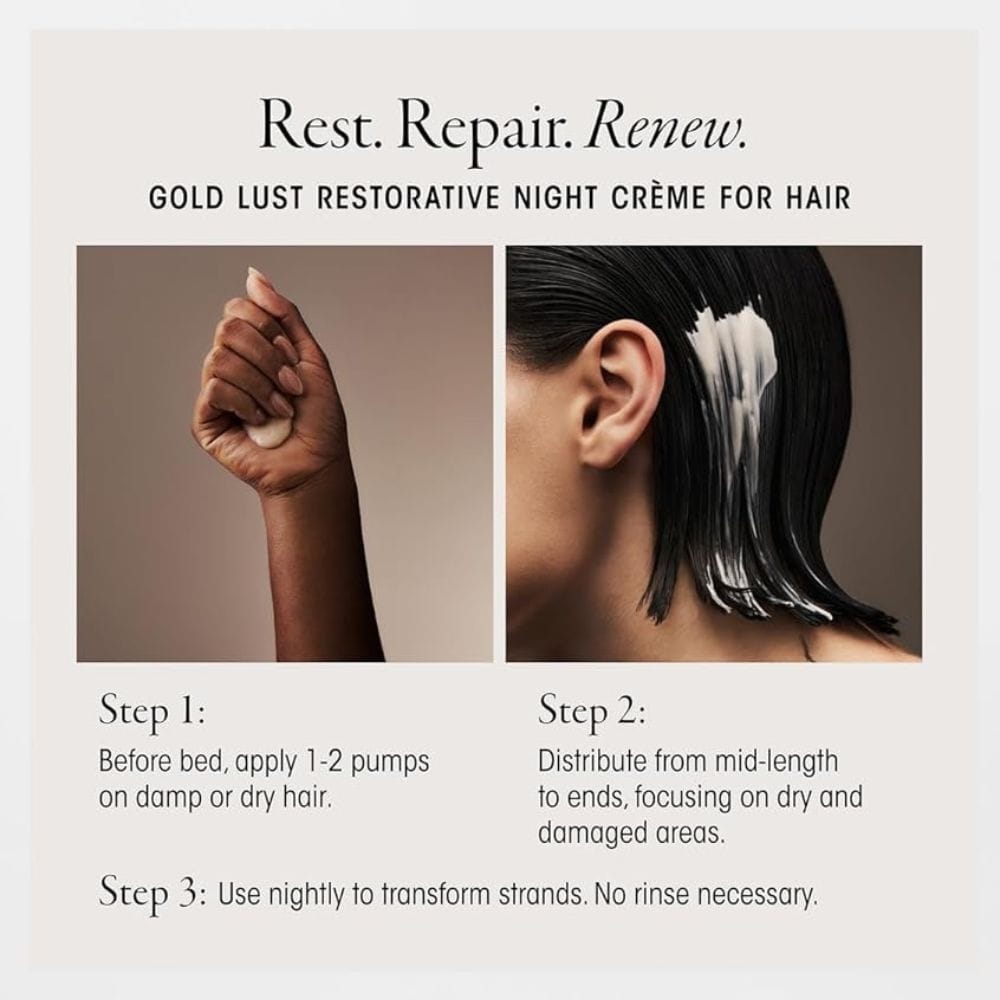 The Gold Lust collection is known for its high-quality ingredients and effective results. Within this collection, the Gold Lust Nourishing Hair Oil and Lust Nourishing Hair Oil are highlighted as luxurious, nourishing hair oil products designed to deeply nourish and improve hair health, making them essential for anyone seeking premium, restorative hair care. The restorative night crème is no exception, boasting a blend of natural oils and advanced technology that works overnight to repair and rejuvenate your hair. Whether you have long hair, fine hair, or even extremely damaged hair, this product aims to restore your hair’s youthful shine and health.