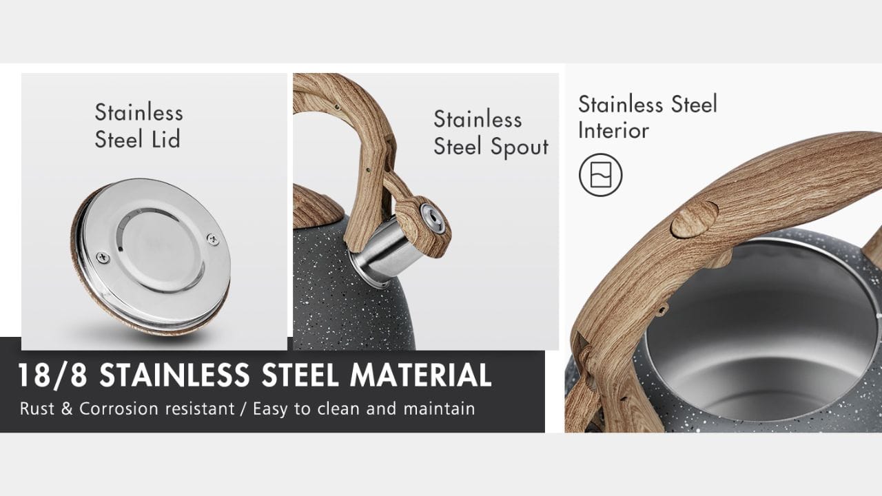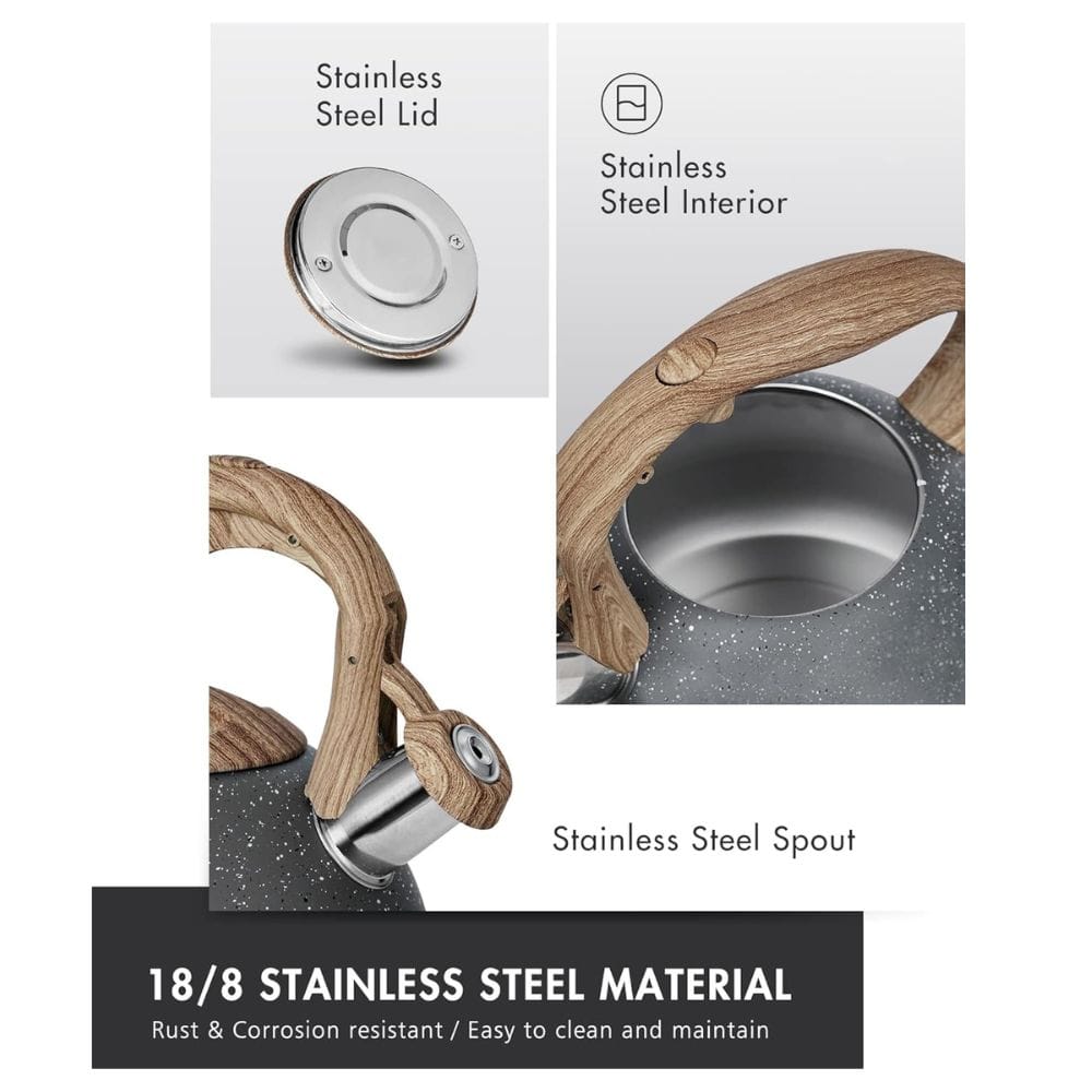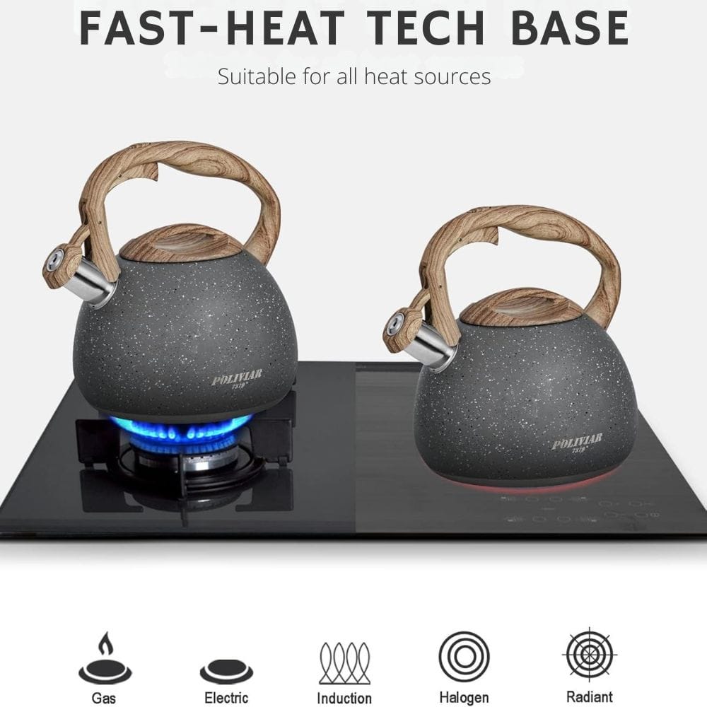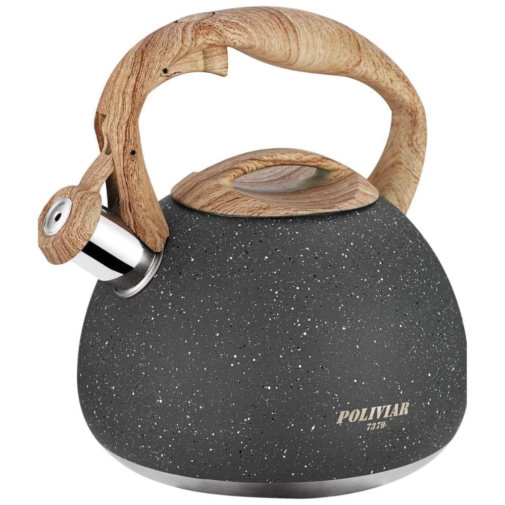 The first thing you’ll notice about the Poliviar tea kettle is its stunning design. The classic stainless steel body not only looks sleek but also promises durability, fitting well in any kitchen. The kettle is available in a slate gray color, which is well-received by customers. Made of food-grade stainless steel, it is designed to be anti-rust for long-lasting use. The Poliviar tea kettle features a wide base, typically 8 inches, which maximizes heat conduction for faster boiling times. This base ensures stability and efficient heating on various stovetops. With a 2.7 quart capacity, it is ideal for preparing multiple cups of tea or coffee quickly and efficiently. Compared to a traditional teapot, the Poliviar kettle offers a similar classic look with improved durability and modern features. The wood pattern handle adds a touch of elegance, making it a beautiful addition to any kitchen countertop.