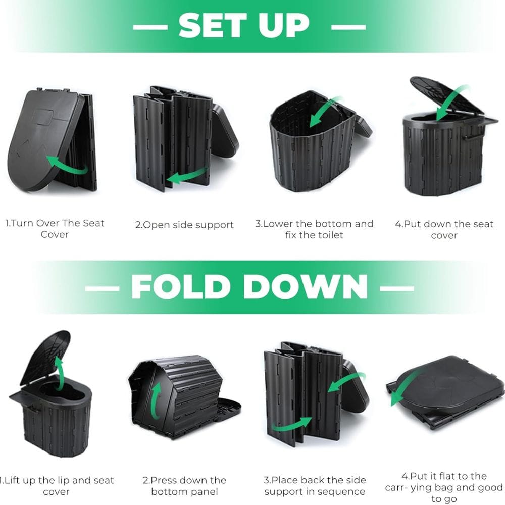 The Sckee camping toilet is crafted from sturdy ABS plastic, ensuring it can withstand the rigors of outdoor use. This material is not only lightweight but also resistant to wear and tear, making it a reliable companion for your adventures. The compact size of the toilet allows it to be easily transported in your vehicle or stored in a carry bag, making it a breeze to take along on any trip. The Sckee camping toilet portable folds down to just 6 inches high, making it easy to store in vehicles or RVs.