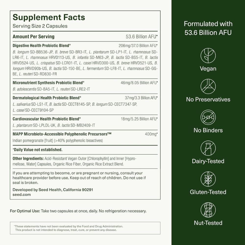 Seed DS-01 Daily Synbiotic is manufactured using a proprietary ViaCap technology, which ensures the survival of probiotics through stomach acid and digestive enzymes. This innovative technology guarantees that the probiotics reach the intestines intact, where they can provide maximum benefit. The product is also vegan-friendly, gluten-free, and free from common allergens, making it suitable for a wide range of dietary needs. Seed adheres to strict quality control measures, including third-party testing for potency, purity, and contaminants, ensuring that each capsule delivers the highest quality and efficacy.