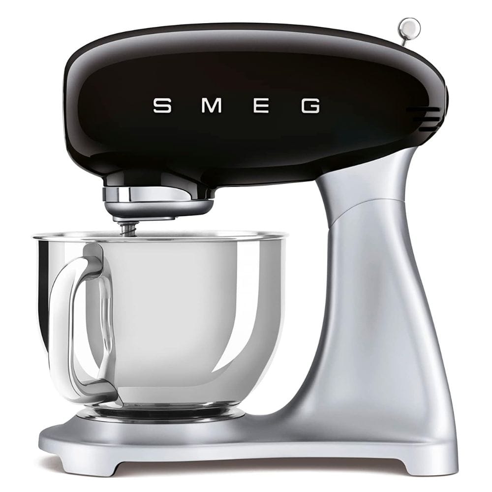 The Smeg stand mixer includes a dough hook, flat beater, wire whisk, and a pouring shield.