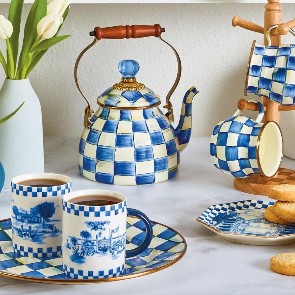 When it comes to choosing a tea kettle that truly stands out, the Mackenzie-Childs enamel tea kettle offers a blend of artistry and practicality that’s hard to match. Unlike many generic tea kettles, the Mackenzie-Childs kettle features hand painted courtly checks and rosy check patterns—signature elements that instantly elevate it from a simple kitchen tool to a decorative piece. The handmade nature of each kettle, complete with a sturdy wood handle, means you’re not just getting a mass-produced item, but a unique work of art that brings character and charm to your kitchen.