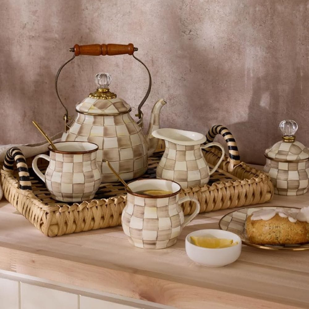 Mackenzie-Childs is renowned for its artistic approach to everyday items, and the enamel tea kettle is no exception. Each kettle is a masterpiece, showcasing the brand’s iconic hand-painted courtly checks. This pattern is not just a design choice but a reflection of the brand’s commitment to creating beautiful products that are both functional and decorative.