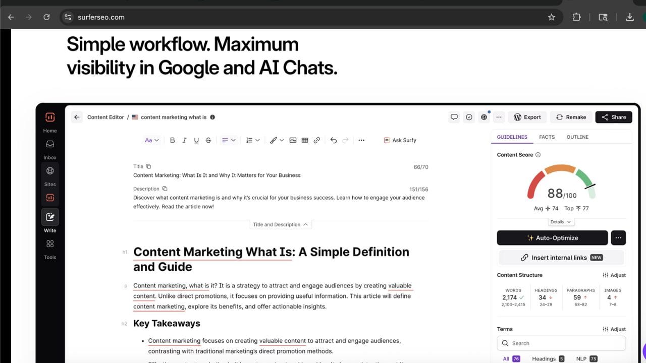 Surfer SEO supports content marketing efforts by offering a comprehensive suite of SEO features designed to boost content visibility and effectiveness.
