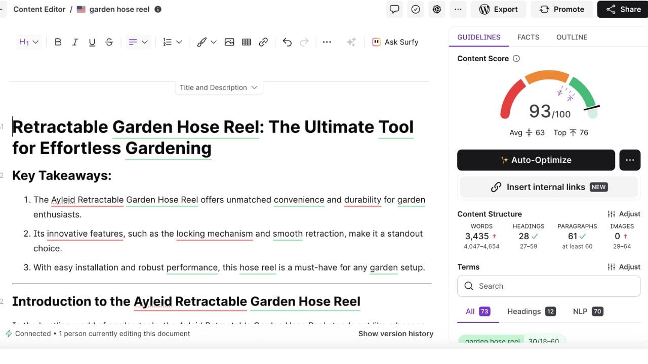 One of the standout elements is the content editor, which closely resembles the familiar layout of Google Docs. This makes it easy for users to write, edit, and optimize content directly within the tool. As you craft your content, Surfer SEO’s algorithm works in real time, analyzing your keyword usage, word count, keyword density, and other on-page SEO factors. The editor provides actionable keyword suggestions and recommendations, ensuring your content is fully optimized for search engines before you hit publish.