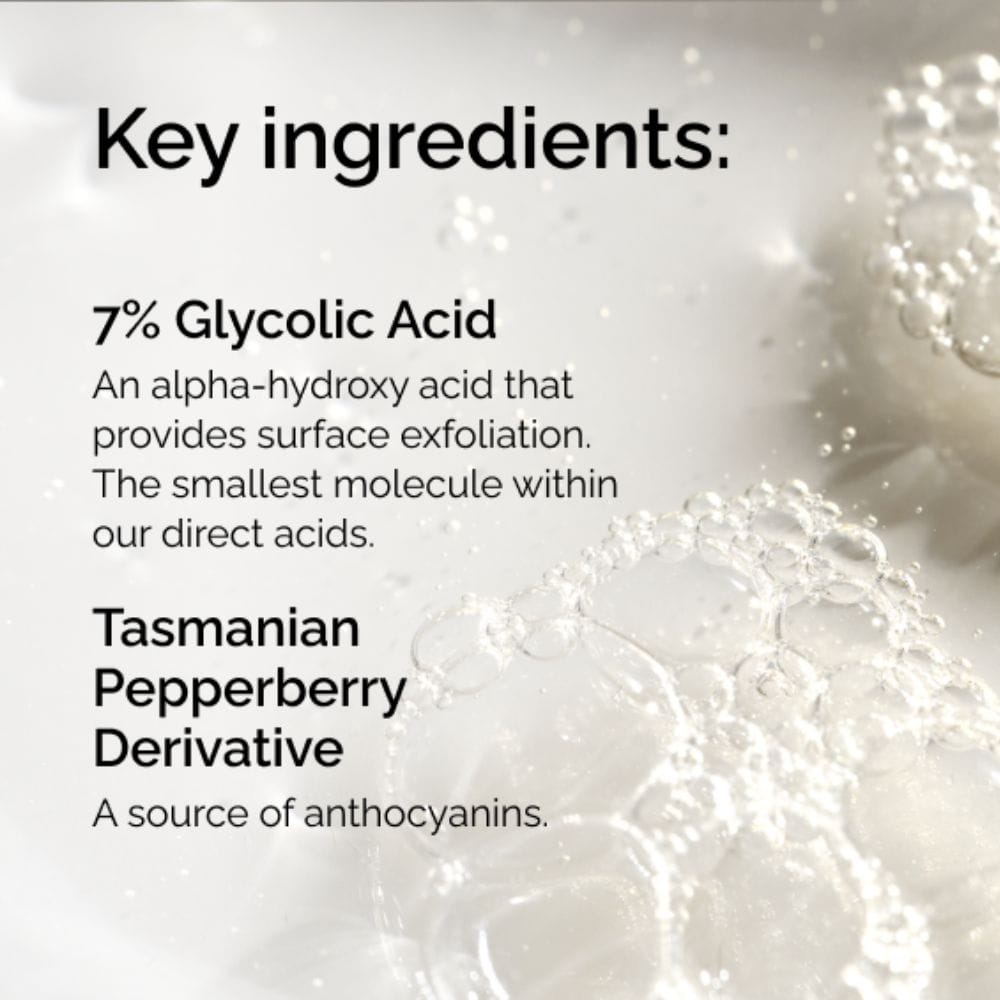 Aloe barbadensis leaf water is another key ingredient in this toner, known for its soothing and hydrating properties. This natural extract helps to calm compromised skin, reducing irritation and redness. It's a perfect partner to glycolic acid, providing a balance that ensures your skin remains nourished and comfortable.