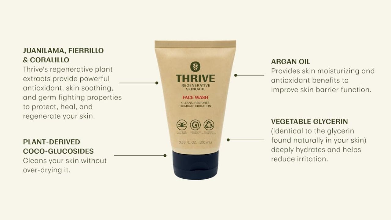 The product is dermatologist tested, ensuring that it meets high standards for safety and efficacy. Users can feel confident knowing that they are using a product that has been rigorously evaluated for its skin-soothing properties. With Thrive, you can wash your face without fear of over-drying or causing irritation, and it is vegan safe.