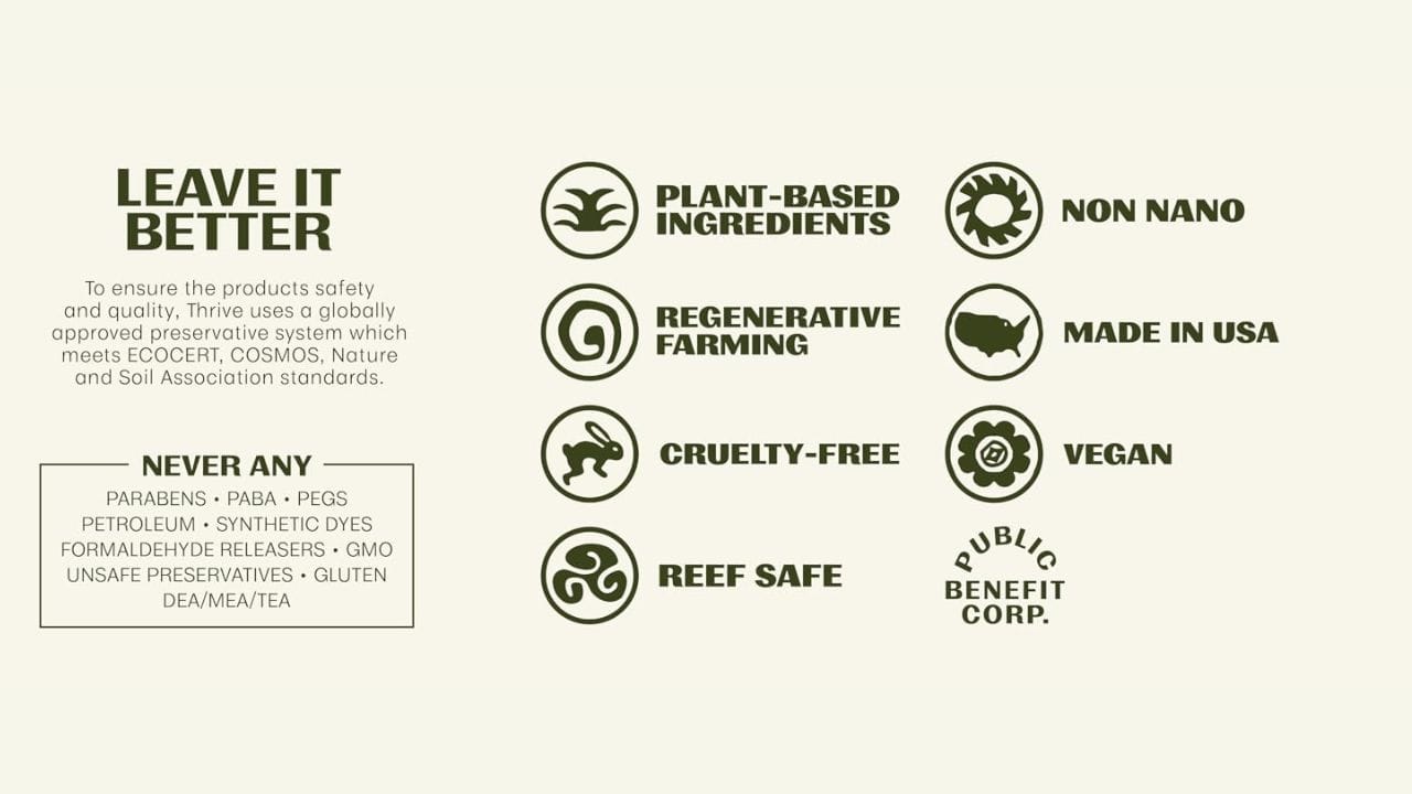 In contrast, Thrive’s natural formula avoids these pitfalls, focusing on skin health and nourishment. Thrive's products are certified as 'Premium Bodycare' by Whole Foods Market, indicating high levels of efficacy and safety, and aligning with sustainable and ethical product standards. While some similar items may offer a lower price point, the quality of ingredients and the commitment to sustainability make Thrive a worthwhile investment for those serious about their skincare.