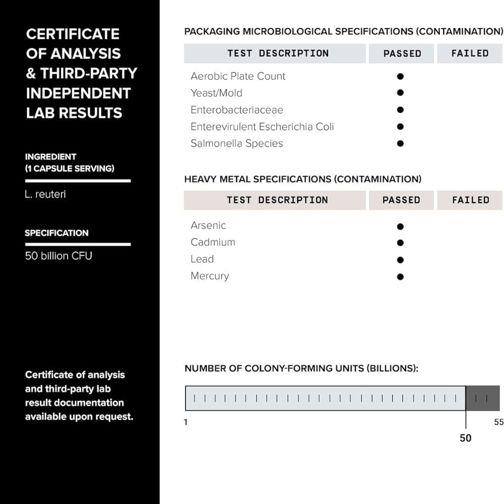 One of the standout features of Toniiq's Lactobacillus Reuteri Probiotic is its commitment to quality and purity. Each batch is individually tested by a third-party independent laboratory to verify its CFU counts and ensure it is free from contaminants and impurities. This rigorous testing process guarantees that you are getting the highest quality product possible.
