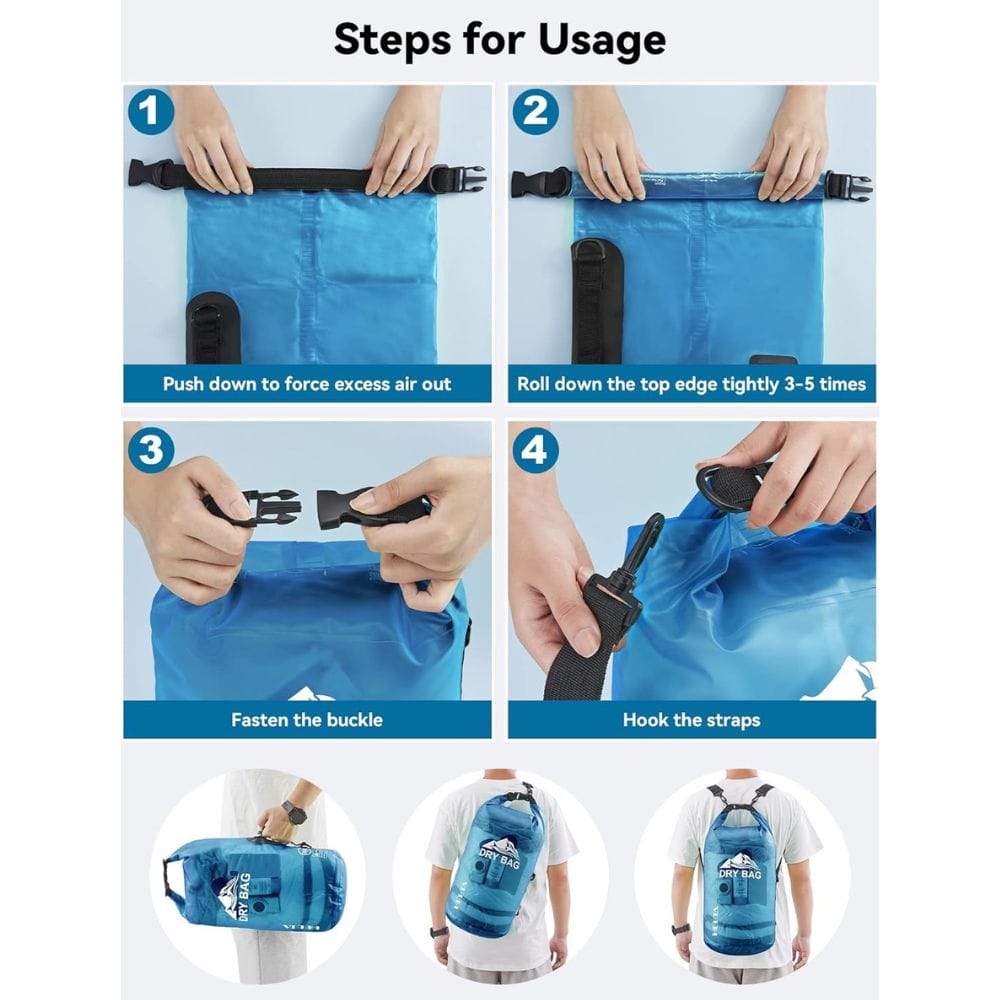 It’s also important to consider the weight and bulk of your packed bag. While a lightweight dry bag is ideal for hiking and backpacking, don’t sacrifice durability for minimal weight. Make sure the adjustable shoulder straps and backpack style carrying options are comfortable for your frame, especially if you’ll be hauling gear over long distances.